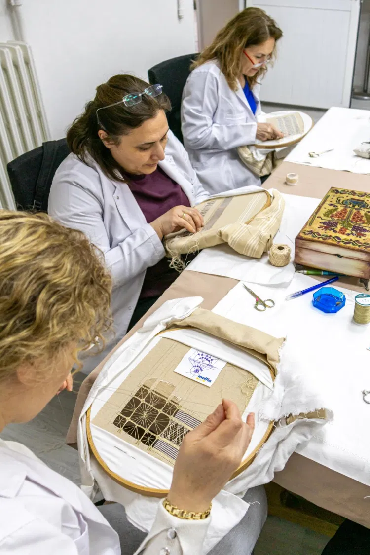 Atölye süresince katılımcılar, bu özgün işlemelerin teknik yapısını keşfederken; desen çözümleme, motif okuma ve yeniden desen oluşturma süreçlerine aktif olarak dahil oldular. Gelenekselin izinden ilerleyen bu uygulamalı çalışmalar, geçmişin estetik kodlarını günümüz tasarım diliyle buluşturma imkânı sundu.