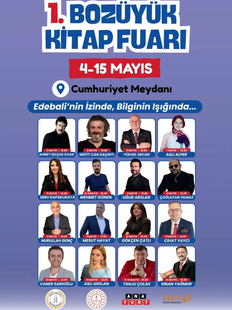 4-15 Mayıs tarihleri arasında gerçekleşecek olan 1.Bozüyük Kitap fuarına Gazeteci-Yazar Yüksel Ercan ile birlikte “Ahmet Selçuk İlkan-Müfit Can Saçıntı-Aslı Alper-Ebru Kapaklıkaya-Mehmet Gönen-Uğur Arslan-Çağlayan Yılmaz-Nurullah Genç-Mesut Hayat-Gökçen Çatlı-Cihat Yaycı-Caner Sarıoğlu-Aslı Arslan-Tanju Çolak ve Sinan Yağmur “ gibi tüm Türkiye’nin tanıdığı isimlerde katılım sağlayacak.